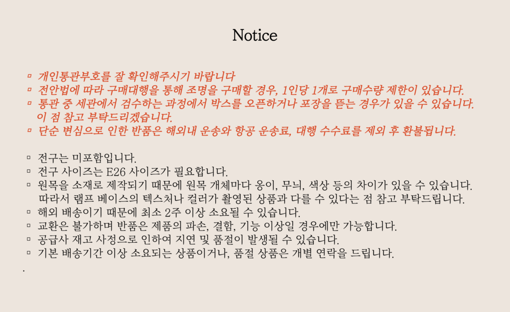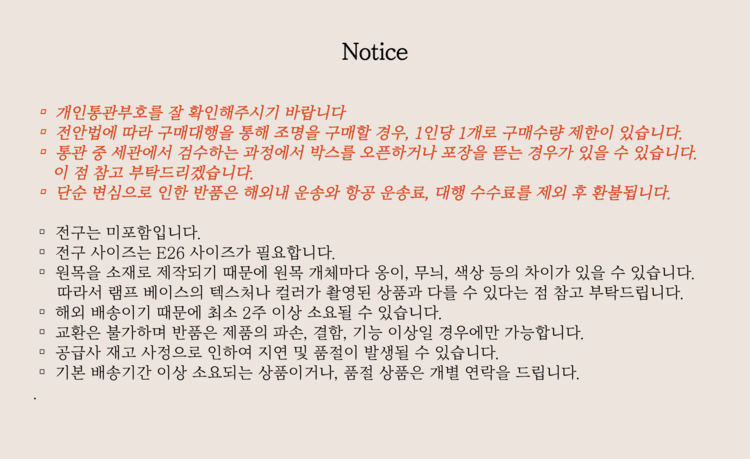 ✔ 쉐이드가 두툼한 편이기 때문에 8W 이상의 전구를 사용해주시면 좋습니다.