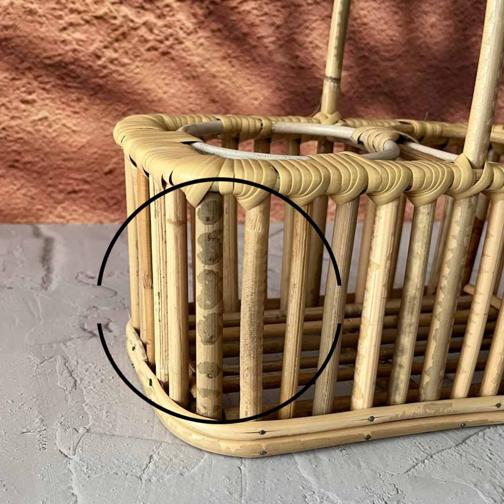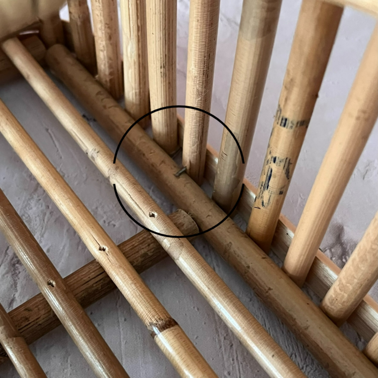 라탄 자체의 얼룩, 뼈대끼리 고정시키기 위한 못 등의 아쉬움이 발견되지만, 불량이 아닙니다.